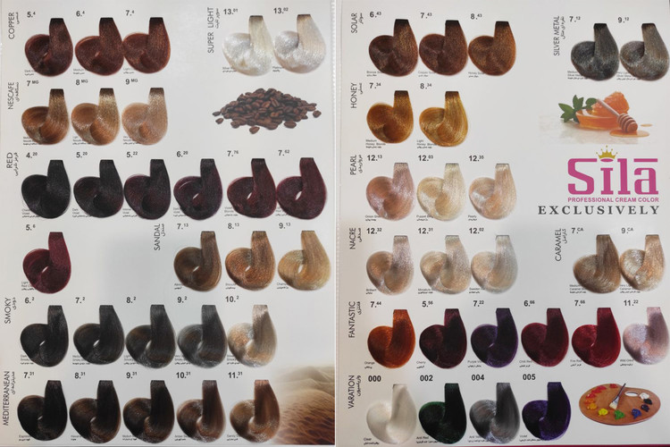 رنگ موی سیلا حجم 120ml حاوی روغن بادام و نرم کننده با درصد آمونیاک کم و دارای ویتامین های B و C می باشد. همچنین رنگ موی سیلا علاوه بر پوشش موهای سفید، درخشان کننده مو بوده و به دلیل دارا بودن لوسیون محافظت کننده دارای ماندگاری بالا می باشد. این رنگ در کشور ما ولی تحت لیسانس کشور ایتالیا ساخته شده و لذا از کیفیت جهانی برخوردار خواهد بودو تمامی استانداردهای رنگ مو را دارا می باشد و به طور کلی یک رنگ ایده آل از هر لحاظ به شمار می آید؛ همچنین دارای قابلیت هایی مثل عدم ایجاد حساسیت در پوست و موی سر بوده و حاوی درصد آمونیاک خیلی کم می باشد. قابلیت اجرای سریع را داشته و سریعاً روی سر رنگ باز می کند.