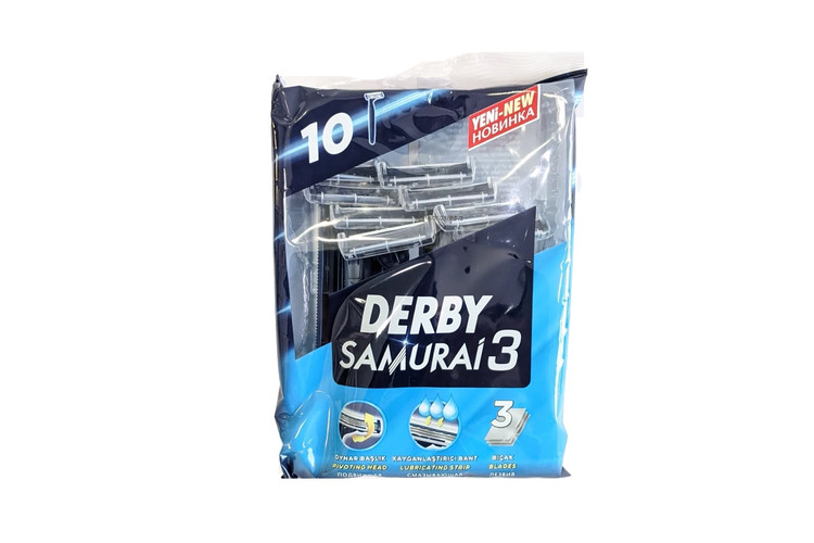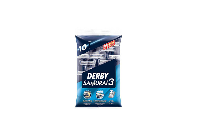 تیغ اصلاح سه لبه دربی مدل Samurai 3 دارای 10 عدد خود تراش با تیغه هایی بسیار با کیفیت می باشد که به راحتی موهای شما را اصلاح می کند. این تیغ اصلاح معمولا ضد آب می باشد و جنس تیغه آن در برابر رطوبت مقاوم است و از جنساستیل ضد زنگ می باشد. این تیغ ها اصلاحی روان و بدون برش را به شما هدیه خواهند داد. این محصولات دارای درپوش های ویژه می باشند که از ایجاد باکتری بر روی آن تا حد امکان جلوگیری به عمل می آورد.